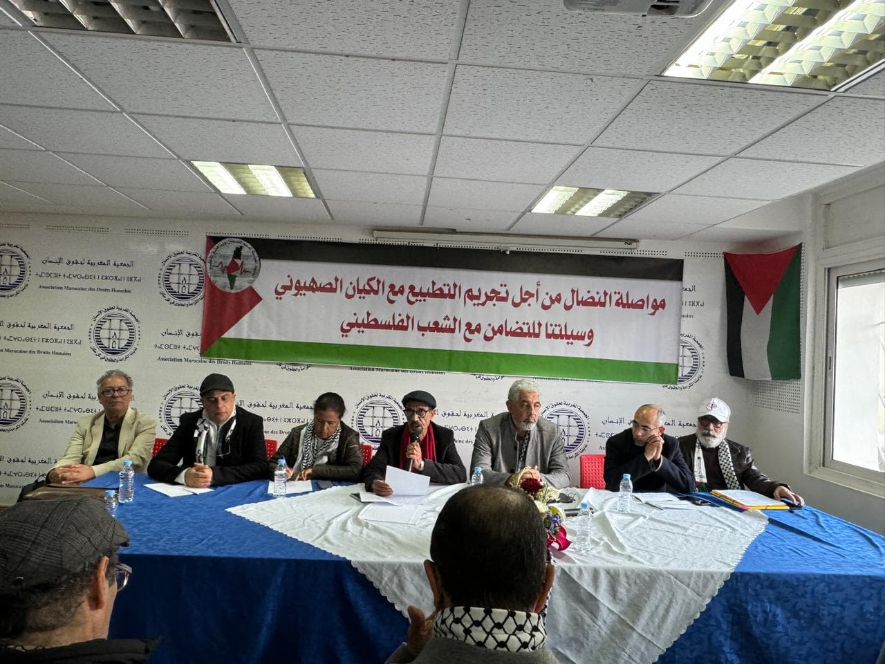 وقد تكاملت الكلمات وهي تثني على الطابع التشاركي والوحدوي الكبير الذي يطبع عمل الجبهة المغربية لدعم فلسطين ومناهضة للتطبيع، كما أجمعت على مواصلة مناهضة التطبيع وإنكار هذه الخطيئة التي يمضي فيها النظام المغربي بقرار منفرد، يخالف إرادة الشعب المغربي ويعارض توجهات كل أحرار العالم الذين يحاصرون الكيان الصهيوني ويقاطعونه بسبب احتلاله وإجرامه وإرهابه الذي فاق كل حد.