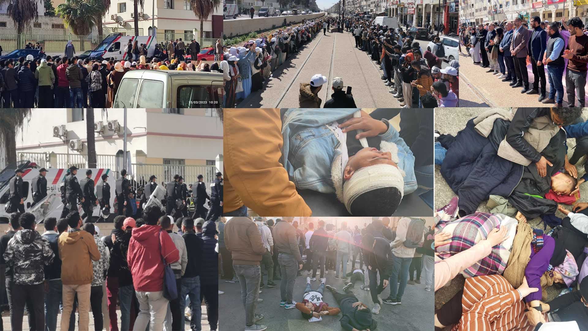 وكانت هذه القوات يوم أمس بعد اقتحامها لكلية الآداب بعين الشق استعملت “أقصى أشكال العنف لمنع النشاط، وإخراج الطلبة بالقوة المفرطة التي أفضت إلى إصابات خطيرة جدا في صفوف الطلبة والطالبات، نقل على إثرها أزيد من 53 طالب وطالبة بسيارات الإسعاف إلى المستشفيات، خلفت 6 كسور، منها واحد مزدوج في كتف طالبة، و4 إصابات خطيرة على مستوى الصدر والرأس، بالإضافة إلى أزيد من 80 إصابة متفاوتة الخطورة، فضلا عن عدد هائل من حالات الاختناق في صفوف الطلبة والطالبات، والإغماء الشديد لدى 12 طالبة، وكذا إتلاف تجهيزات الملتقى ومصادرتها”، وفق ما كشف عنه بيان لمنظمة الاتحاد الوطني نشرته في مقعها صباح اليوم.