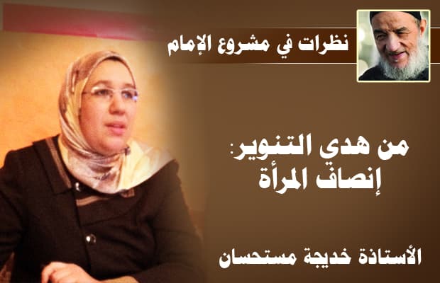لقد أنصف الإمام عبد السلام ياسين رحمه الله المرأة حين قارب قضيتها من جهات وزوايا مختلفة، فاعتبر أن ما آلت إليه أوضاعها نتيجة حتمية لأحداث وظروف وعوامل اشتبك فيها التاريخي والسياسي والفقهي والاجتماعي… يقول رحمه الله: قضية المرأة المسلمة وقضايا المسلمين الأخرى شأن واحد والحديث عن تحرير المرأة وإنصافها، وعن تاريخ بلائها دون ربط ذلك بالسياق التاريخي السياسي الاقتصادي الفقهي الاجتماعي فصل اعتباطي لما لا ينفصل) 2 .
