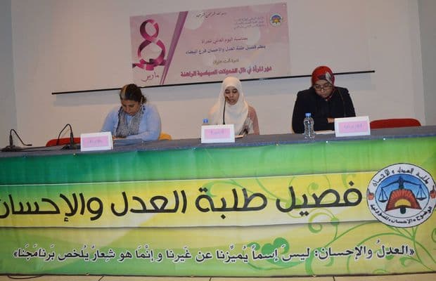 بمناسبة اليوم العالمي للمرأة، نظم فصيل طلبة العدل والإحسان، فرع جامعة الحسن الثاني، زوال أمس الخميس 10 مارس 2016 برحاب كلية الآداب عين الشق، ندوة سياسية لتسليط الضوء على “دور المرأة في ظل التحولات السياسية الراهنة”..